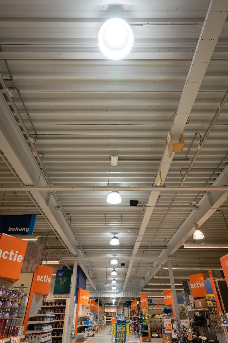Als eerste plaatsten we armaturen van Noxion die samen zorgden voor een goed verlichte en comfortabele winkelomgeving. Het is belangrijk dat de winkel goed verlicht wordt, omdat zichtbaar licht een enorme impact heeft op hoe we de winkel emotioneel ervaren. Onbewust worden we namelijk aangetrokken door goed verlichte winkels en producten. We plaatsen ook LED highbays met speciaal gekozen reflectors, die ervoor zorgden dat het licht goed verspreid werd. Hierdoor worden alle producten goed verlicht. Aangezien de deksel en kap van de highbay prismatisch zijn afgesloten, kun je niet verblind worden door de verlichting.